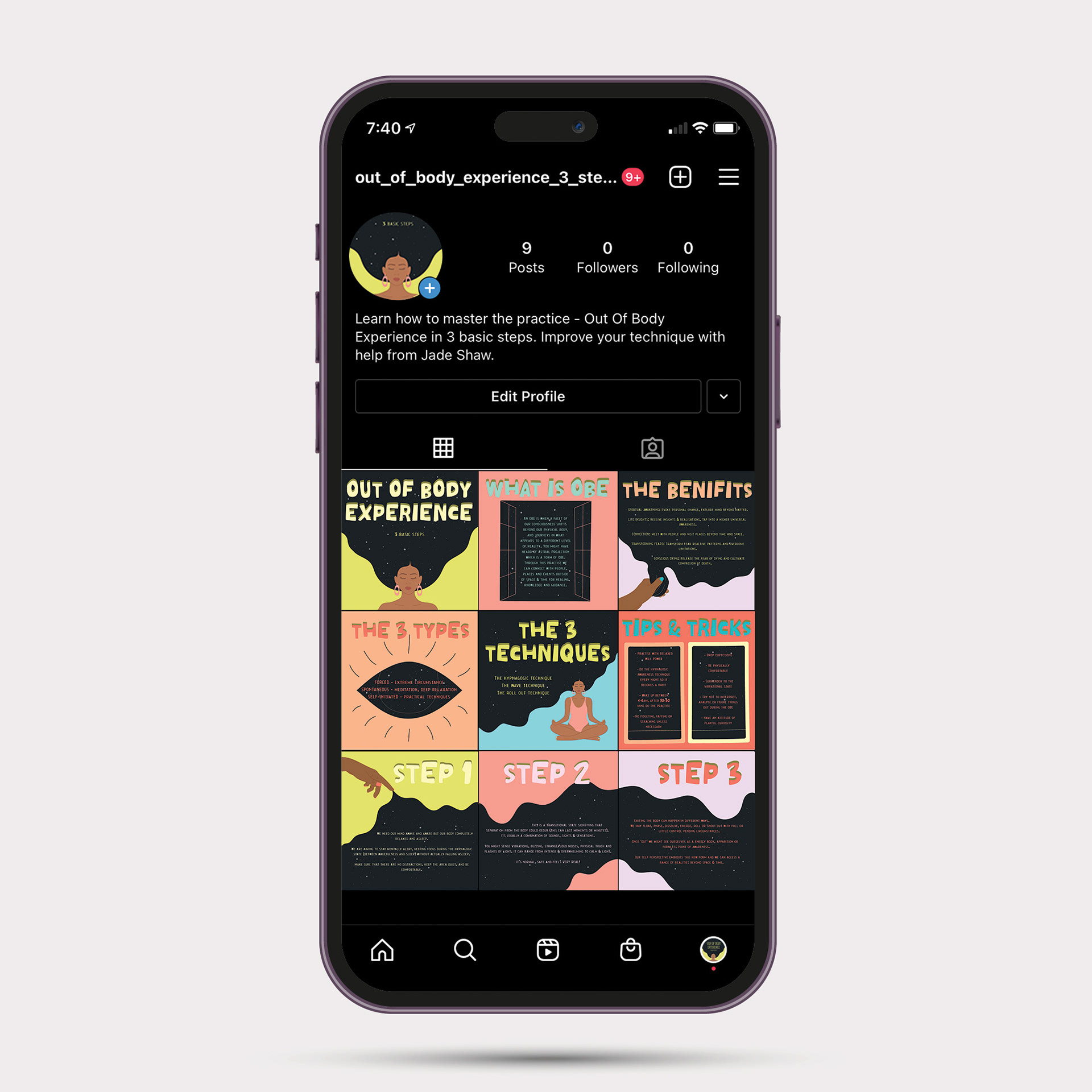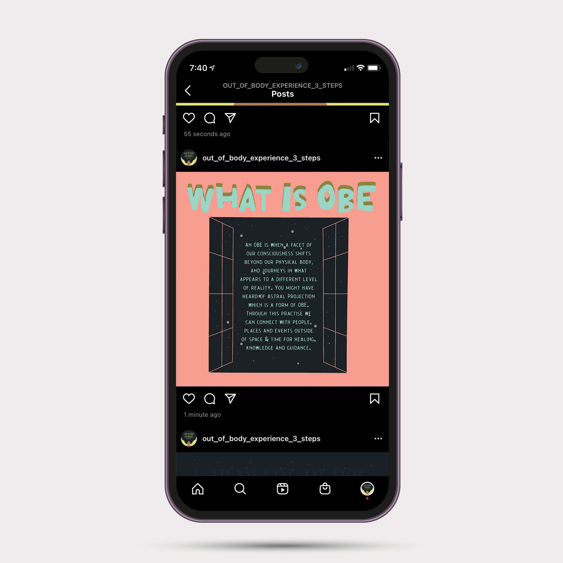 I have used visual communication to create a step-by-step guide on how to complete an out-of-body experience safely, with social media posts. the chosen font for the titles is Nimayo, it's bold fluidity shows movement and looks like it's floating, with a shadow behind it that represents consciousness shifting from the physical body. the context font is Galeum Blur Demo, its feels eerie with it being blurry and uneven however, mixed with the bright colours is meant to feel like a friendly aura.